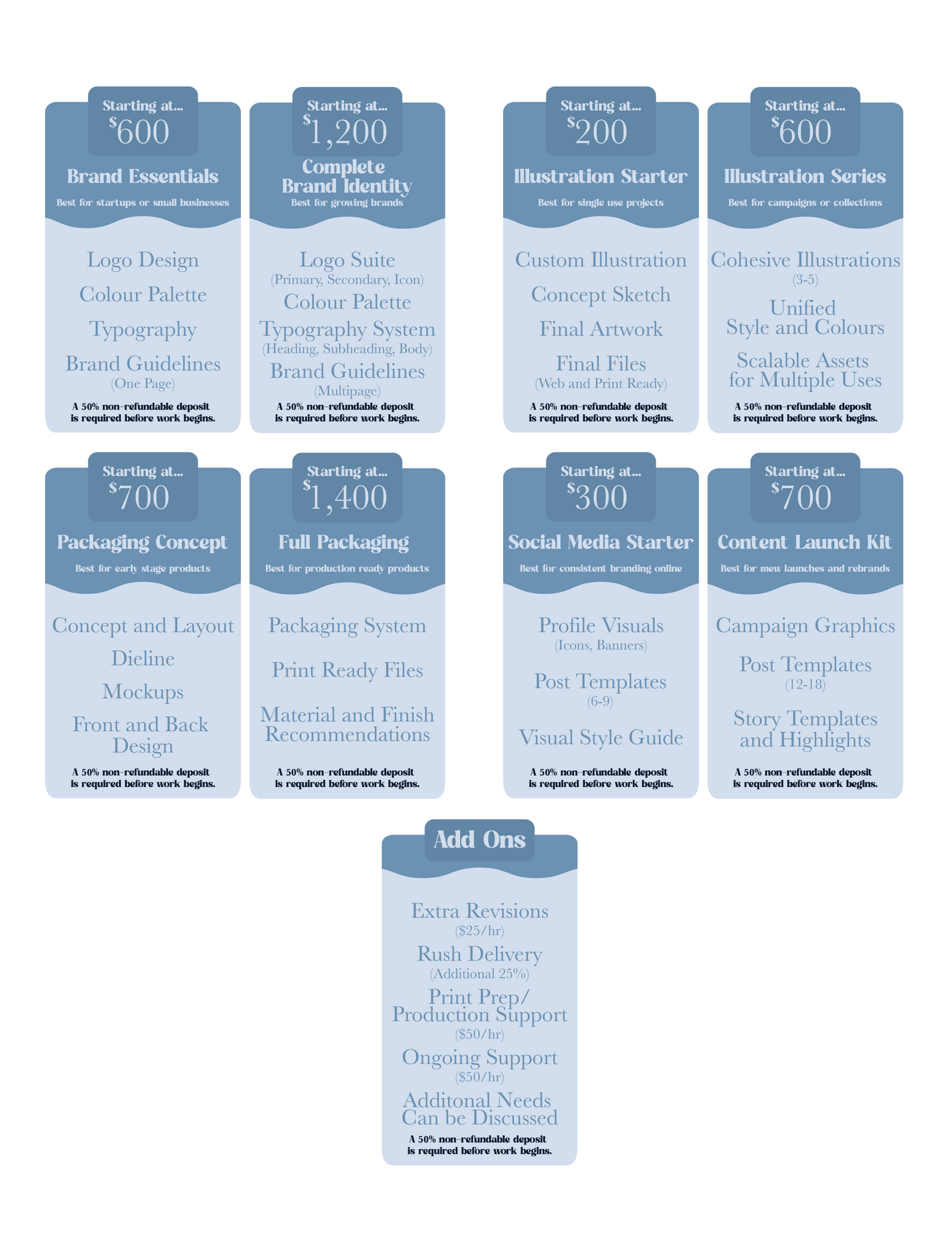A 50% non-refundable deposit is required to confirm the project and begin work.